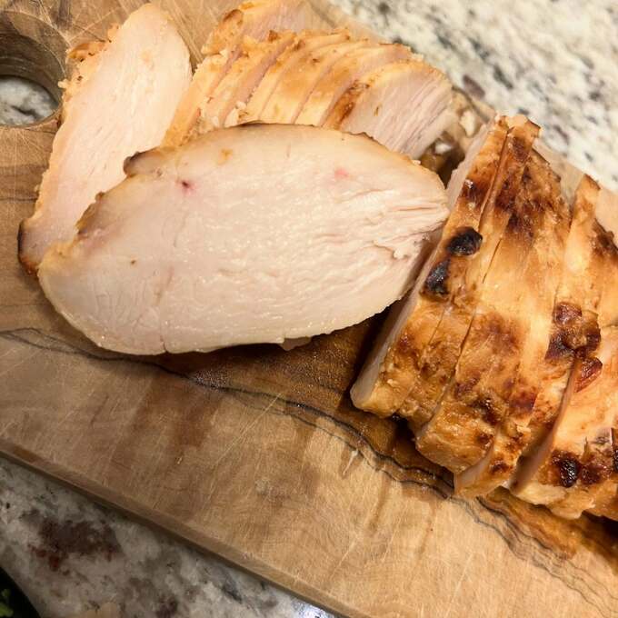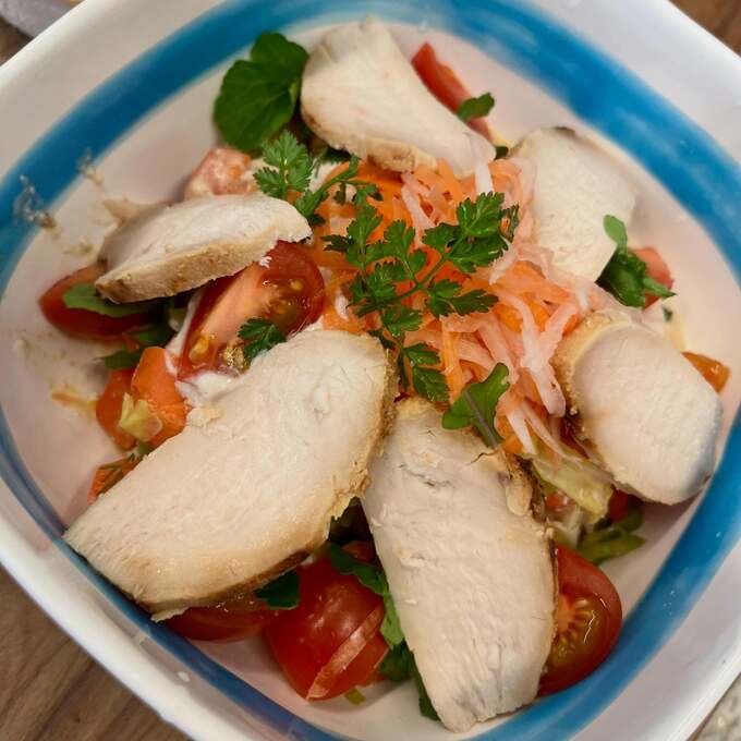 さらに、「味噌で1日漬けたチキンでハムチキンにしてサラダと!」と、自家製のハムチキンも添えたことを明かしました。完成した彩り豊かなサラダの写真も複数投稿されています。