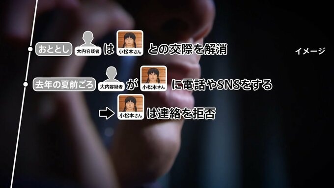 大みそかに一体、何があったのか。警察によりますと、大内容疑者はおととし、小松本さんとの交際を解消。去年の夏前ごろには、電話やSNSで小松本さんとの接触を試みていましたが、小松本さんは着信拒否をするなどしていたといいます。