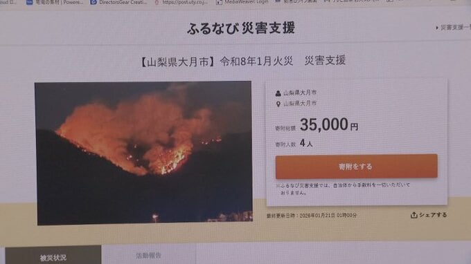 「火の勢いは だいぶ収まってきている」扇山の山林火災 発生から2週間 一方で、消防機材が大量破損 ふるさと納税で寄付募る 山梨 テレビ山梨 2026年1月21日(水) 18:17 国内 こうした状況を受け上野原市と大月市は消防装備品や登山道の復旧費用などにあてるため、ふるさと納税を活用した寄付を募っています。 いずれも返礼品はなく、ふるさと納税の仲介サイトで寄付することができます。