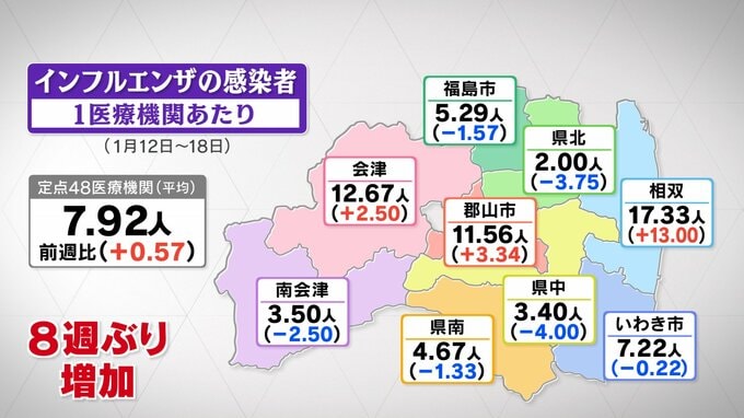 県によりますと、18日までの1週間に確認されたインフルエンザの感染者数は、1医療機関当たり7.92人で、8週ぶりに増加しました。地域別では、相双が17.33人と最も多く、次いで会津が12.67人、郡山が11.56人などとなっています。