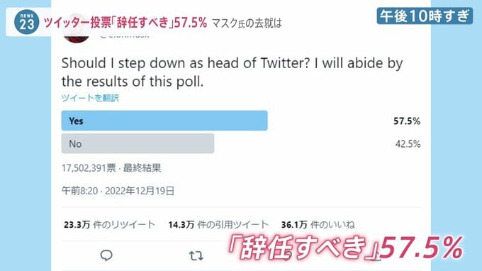 ツイッターのイーロン・マスクCEOが「トップから退くべきか」を問うアンケートを自らのツイッターで行いました。「結果に従う」としていたマスク氏。1750万件の投票が行われた結果、「辞任すべき」が多数となって…