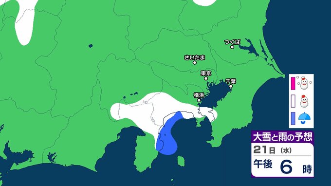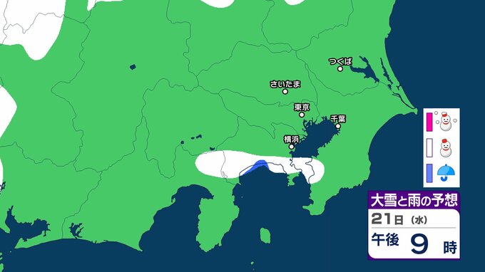 【東京の雪予報】あす(22日)東京・埼玉・横浜に雪雲が...今夜(21日)は神奈川・千葉で雪か 交通への影響に注意を / 東京・横浜・千葉・さいたま・つくば 21日~25日雪雨シミュレーショ【気象庁/21日午後4時更新】 RSK山陽放送 2026年1月21日(水) 16:40 国内 天気 21日(水) 神奈川県から千葉県にかけて雪雲が広がる予報となっています。