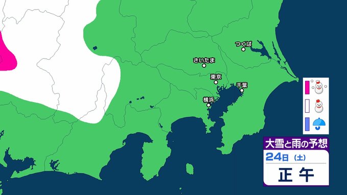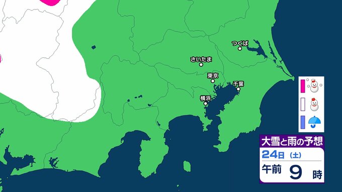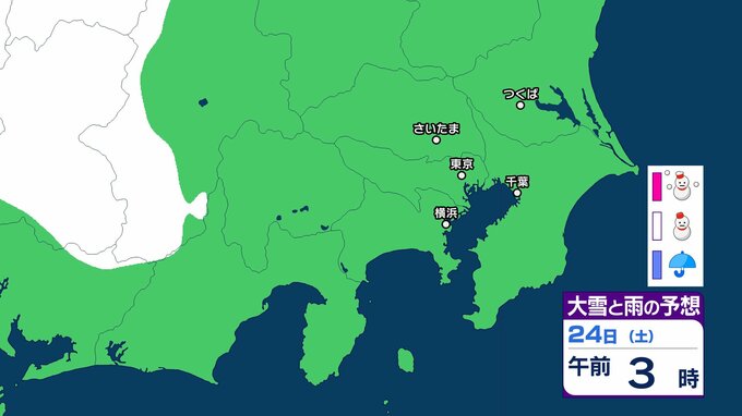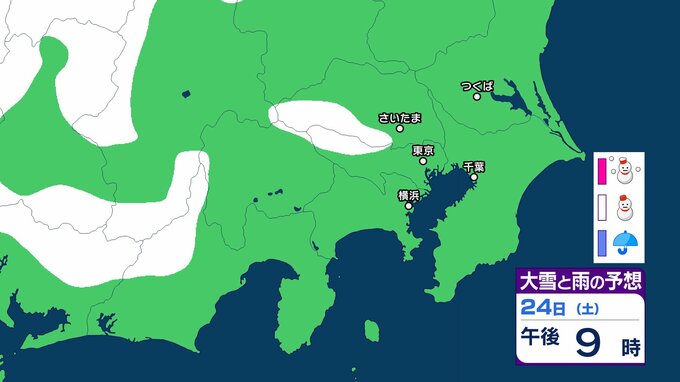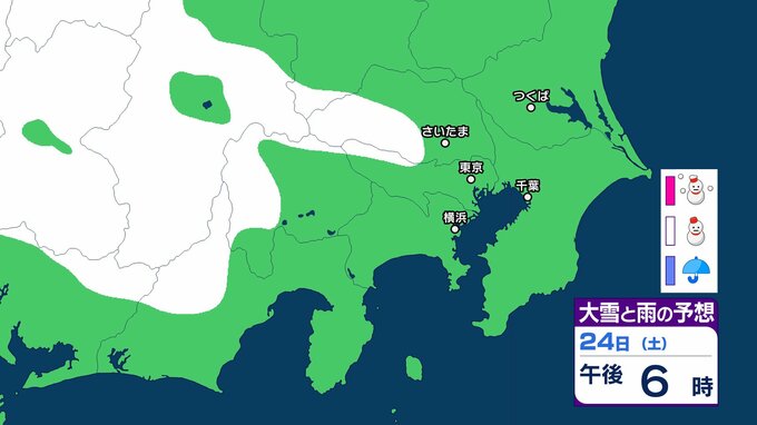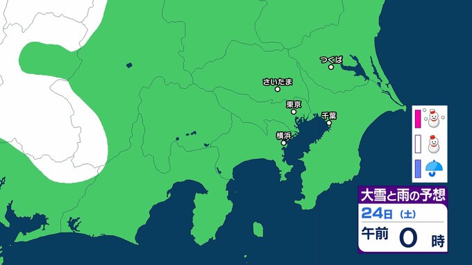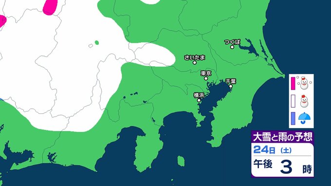 【東京の雪予報】あす(22日)東京・埼玉・横浜に雪雲が...今夜(21日)は神奈川・千葉で雪か 交通への影響に注意を / 東京・横浜・千葉・さいたま・つくば 21日~25日雪雨シミュレーショ【気象庁/21日午後4時更新】 RSK山陽放送 2026年1月21日(水) 16:40 国内 天気 24日(土) 24日(土)は午後から埼玉県と東京都の広い範囲で雪雲が広がる予報となっています。 ▶雪と雨のシミュレーション
