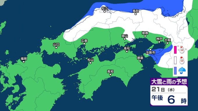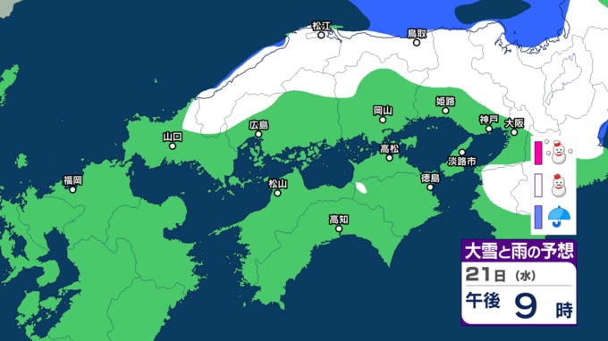 中国地方ではきょう(21日)18時からあす(22日)18時までに予想される24時間降雪量は多い所で、