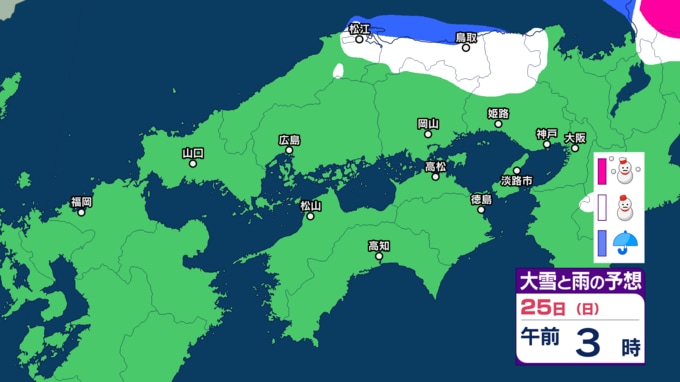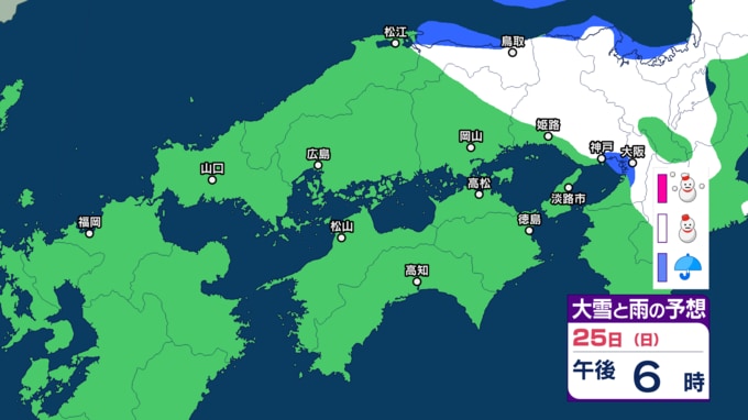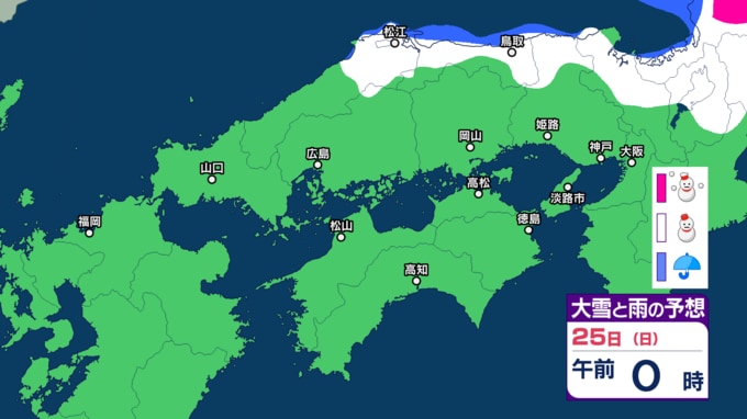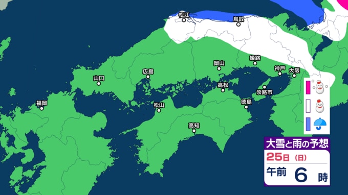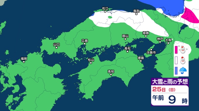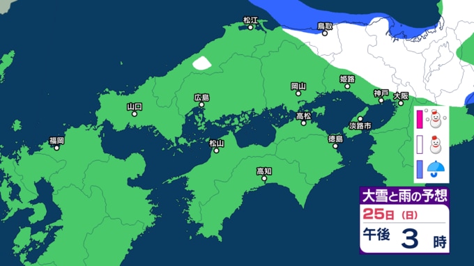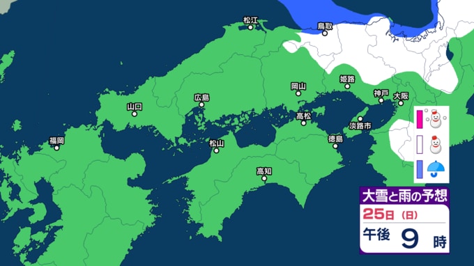 【中国・四国地方の雪 どうなる?】山陰では今夜からあす(22日)夜頃にかけて「警報級の大雪」か 四国地方は23日夜から24日頃にかけて山地を中心に大雪のおそれ【気象庁 雪雨シミュレーション/ 21日現在】 RSK山陽放送 2026年1月21日(水) 17:14 国内 25日(日) 予想にはブレ幅があるため、今後の気象情報をこまめに確認してください。 ▶雪と雨のシミュレーション