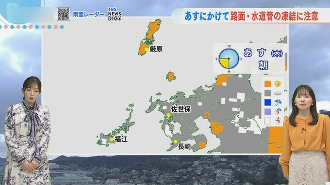 【長崎の雪は?】22日が「寒さの底」氷点下に 降雪1センチ予想 週末は‟ボタン雪‟ 雨雪シミュレーション 長崎放送 2026年1月21日(水) 17:47 国内 22日は「0℃以下」の冷え込みに 22日(木)の予想最低気温は、長崎県内の多くの地点で0℃を下回る見込みです。 特に島原半島や諫早市、大村市、川棚町、東彼杵町、五島などでは氷点下となる予想です。