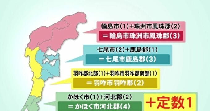 県議会の各会派からなる検討懇話会は、県議選での1票の格差を是正するため、能登地域の8つある選挙区を4つの選挙区に統合して1人区を解消し、かほく市・津幡町・内灘町からなるかほく市河北郡選挙区の定数を1増やす方針です。