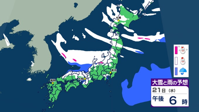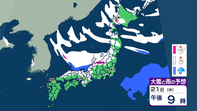 気象庁は21日夕方、大雪に関する情報を発表しました。 日本列島は25日頃にかけて、強い冬型の気圧配置が続く見込みです。特に今夜から明日22日にかけては、数年に一度クラスの非常に強い寒気が流れ込み、西日本から北日本の広い範囲で大雪となるでしょう。