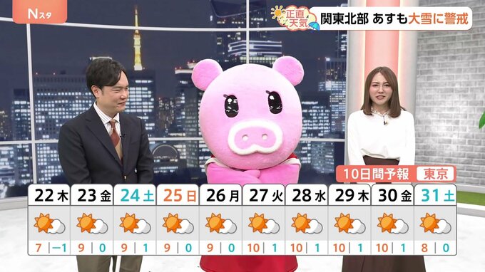 1月22日の関東の天気を山形純菜キャスター、河津真人気象予報士がお伝えします。・厳寒週間 気温ひとケタずらり・防寒必須 北風でさらに体感↓・関東北部 22日も大雪に警戒