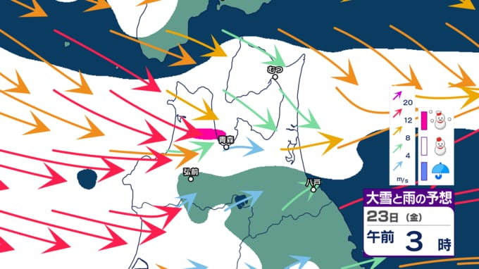 24日までの72時間でみると津軽・三八上北の山沿いでは210cm、平地では110cmの雪が降る予想となっています。