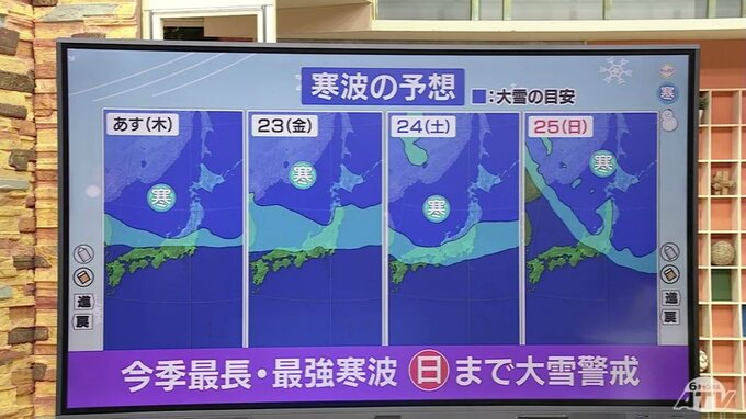 今季“最強・最長”の大寒波は、今週末25日(日)まで長い期間居座る見込みであるため、週明けまで大雪には警戒が必要です。