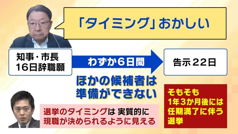 この間、わずか6日。片山氏は「選挙のタイミングは実質的に現職が決められるように見える」「他の候補者は準備ができない」と指摘します。そもそも、1年3か月後には任期満了に伴う選挙が予定されているのです。