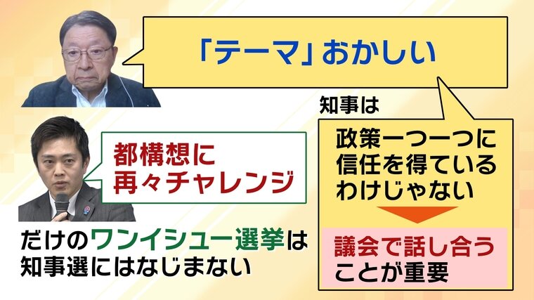 吉村知事は、都構想実現に向けた3度目の住民投票を実施するために選挙で民意を問うとしていますが、こうした「“ワンイシュー選挙”は知事選にはなじまない」と片山氏は指摘。