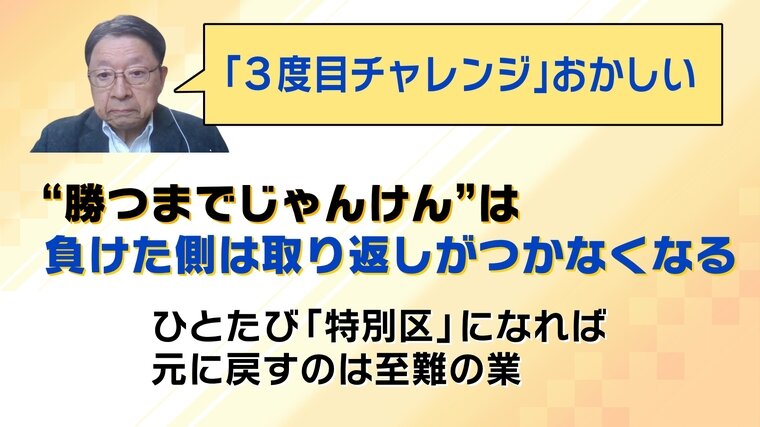 ひとたび「特別区」ができると、元に戻すのは非常に困難で、「“勝つまでじゃんけん”は負けた側は取り返しがつかなくなる」と片山氏は言います。