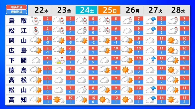 四国地方では、23日夜から24日頃にかけて、山地を中心に大雪となり、平地でも積雪となる所があるでしょう。
