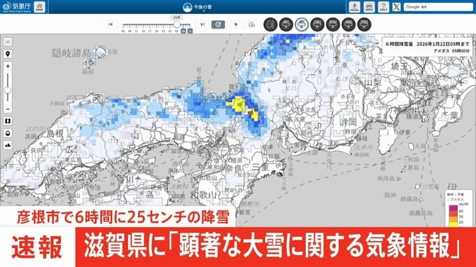 気象庁は午前4時17分、滋賀県に「顕著な大雪に関する気象情報」を発表しました。この情報が発表された地域では、短時間に大雪が降り、重大な災害が発生する可能性が高まっています。不要不急の外出を控え、大雪に…