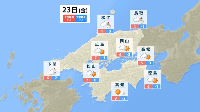 四国地方では、23日夜遅くから24日午後にかけて、山地を中心に大雪となり、平地でも積雪となる所があるでしょう。