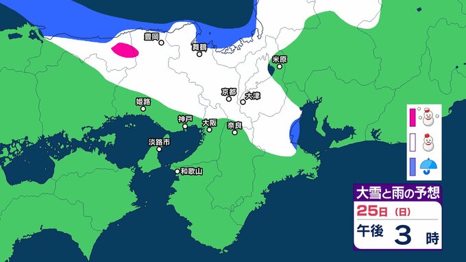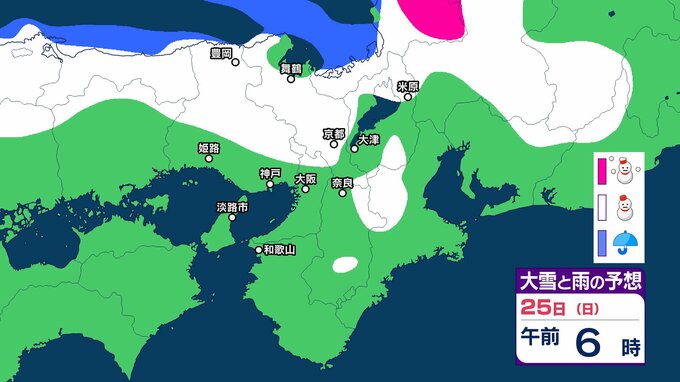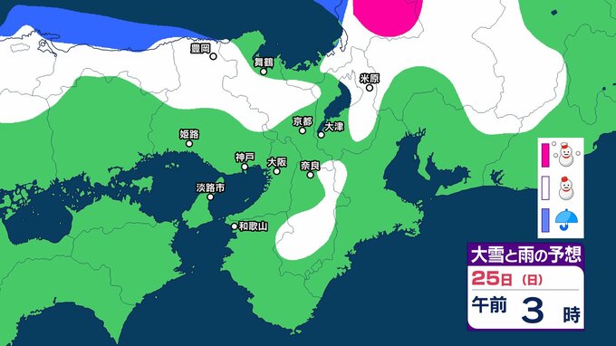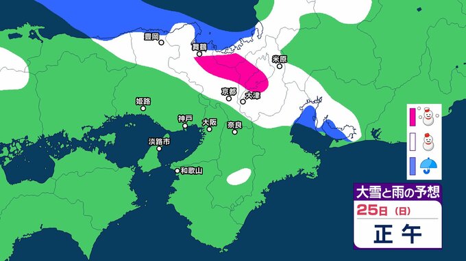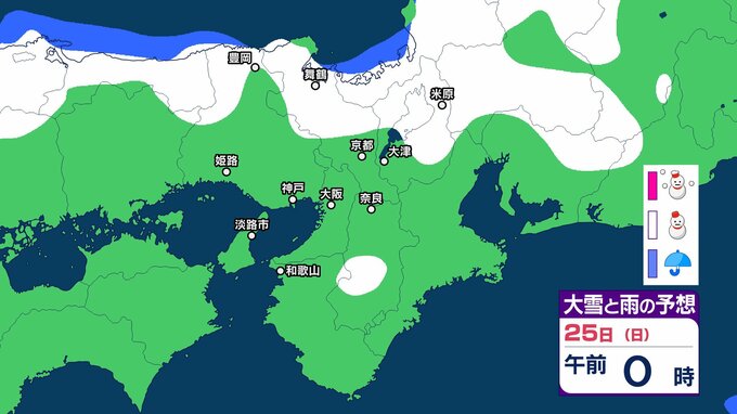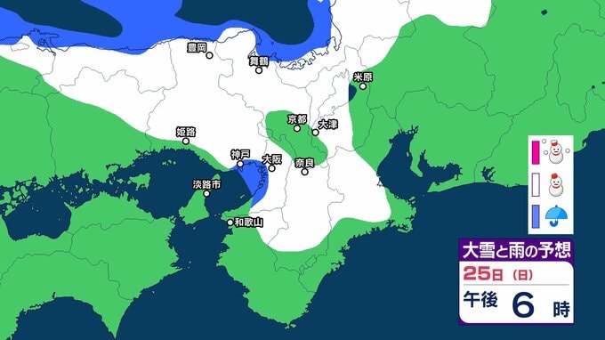 【関西の雪どうなる?】近畿地方ではきょう(22日)夜遅くにかけて局地的に雷雲が発達する可能性が 普段雪の少ない近畿中部の平地でも大雪となるおそれ 大阪・神戸・京都・奈良・和歌山・滋賀 雪雨シミュレーション 【気象庁 22日午前10時更新】 RSK山陽放送 2026年1月22日(木) 10:00 国内 天気 25日(日) 25日(日)は近畿地方の日本海側で雪雲が予想されていて、午後からは近畿地方南部でも雪雲が予想されています。 ▶雪と雨のシミュレーション