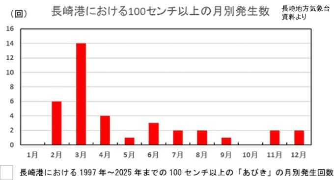 長崎港のデータ(1997年~2025年)では、100センチ以上の大きなあびきは3月に最も多く発生しており、次いで2月、4月と春先に集中しています。