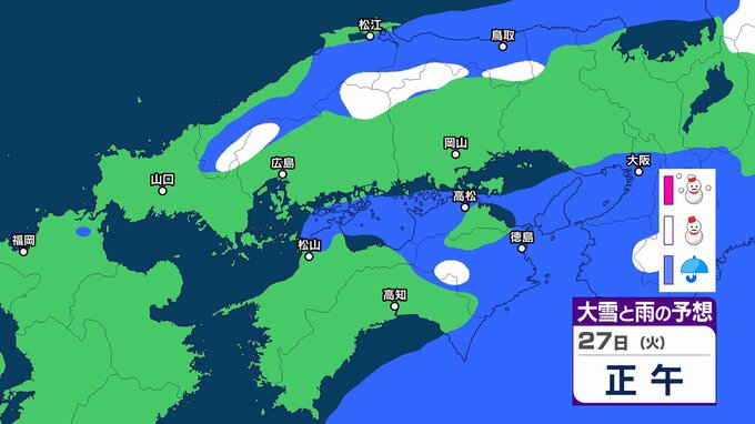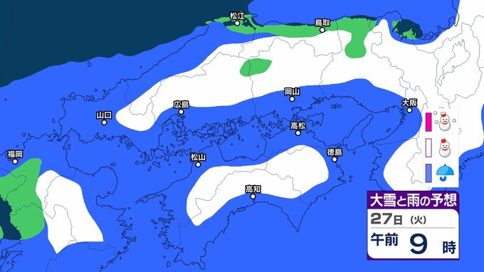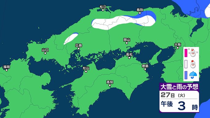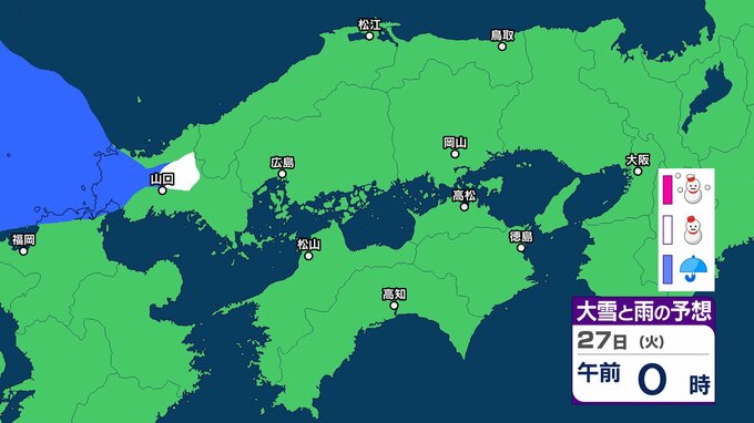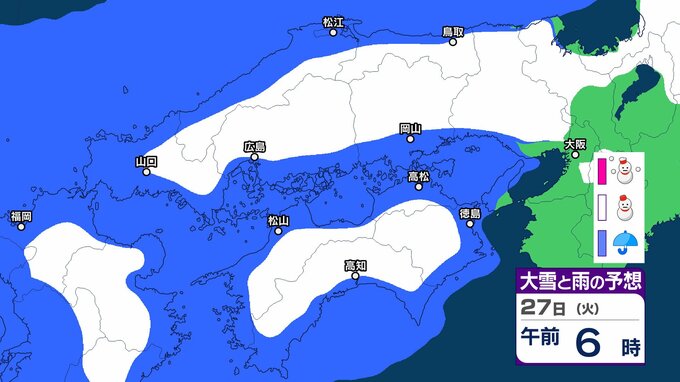 【中国・四国の雪 どうなる?】山陰は警報級の大雪、山陽北部で大雪のおそれ...四国地方は平地でも積雪の可能性 22日(木)~27日(火)にかけての雪雨シミュレーション【気象庁 22日現在】 RSK山陽放送 2026年1月22日(木) 10:24 国内 天気 27日(火) 予想にはブレ幅があるため、今後の気象情報をこまめに確認してください。 ▶中国・四国地方の雪雨シミュレーション