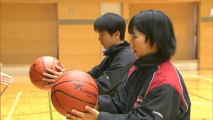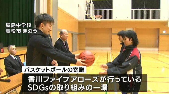 バスケットボールB3リーグ「香川ファイブアローズ」などが高松市の中学校にバスケットボールを贈りました。
