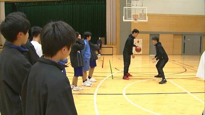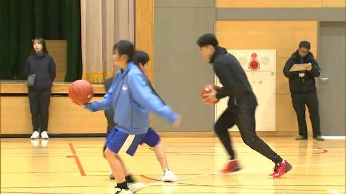生徒たちは、さっそくそのボールを使って、ファイブアローズの請田祐哉選手と高橋育実選手から直接指導を受けました。