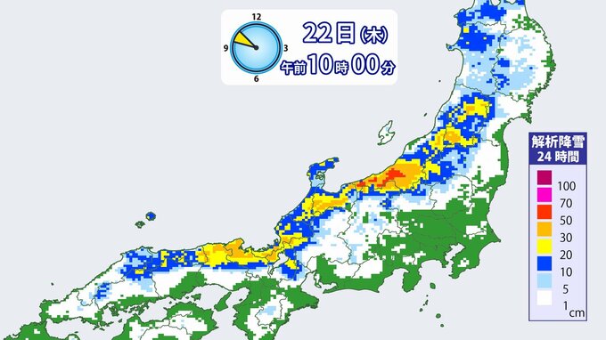 気象庁によりますと、北日本から西日本の日本海側を中心に、25日頃にかけて山沿いや山地だけではなく平地でも大雪となる所がある見込みです。北日本と西日本の日本海側では22日は、東日本の日本海側では23日にかけて、大雪による交通障害に警戒してください。