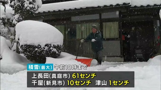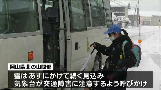 この冬最も強い寒波の影響で岡山県北の山間部では雪が続いていて、午前10時までに、真庭市の上長田で61センチ、新見市千屋で10センチ、津山で1センチの積雪が観測されています