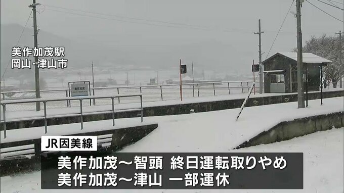 この雪の影響で、JRは因美線の美作加茂駅から智頭駅間で終日運転を取り止めています。JRは今後の気象状況によって列車の遅れや運転取り止めが発生する可能性があるとしています。