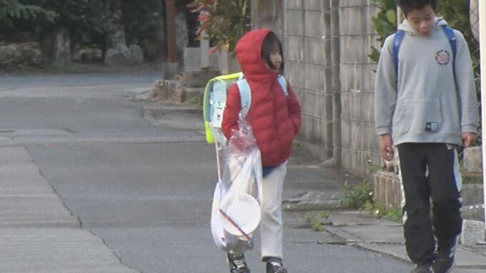 午前3時に気温9.5度を記録した国頭村奥では、早朝、厚手の服を着込みポケットに手を入れて登校する児童の姿が見られましたが、中には長袖1枚で登校するツワモノもいました。