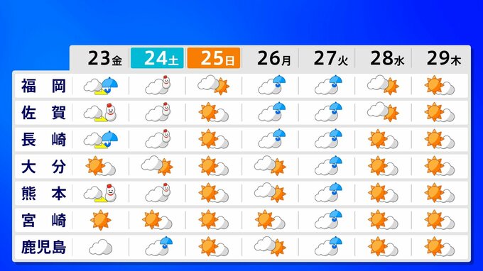 《雪シミュレーション》、29日(木)までの《九州各都市の週間予報》を画像で掲載しています。