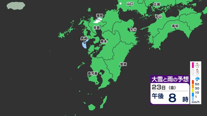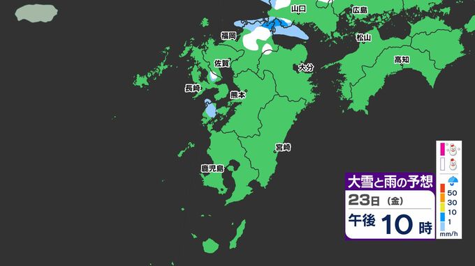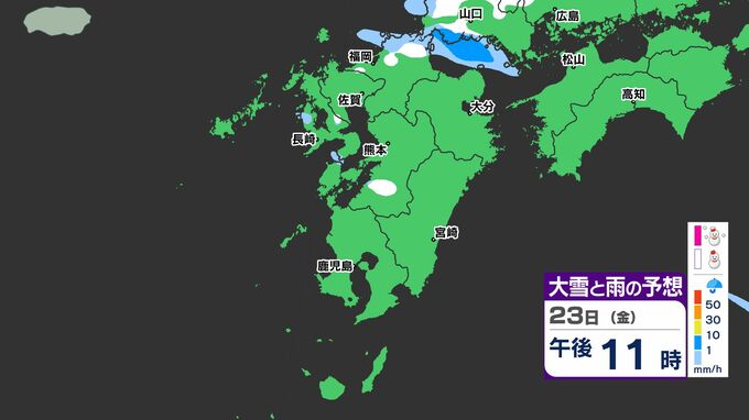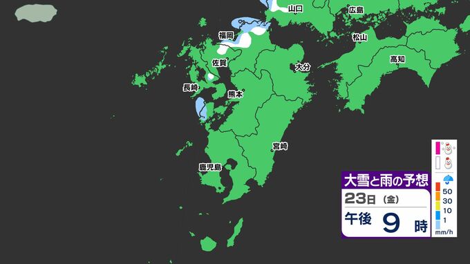 23日(金)夜には、福岡県・佐賀県・長崎県・熊本県に「雪」の予想が現れます。24日(土)昼過ぎまでは九州の広い範囲に「雪」が予想され、大分県には「大雪」の予想も現れます。