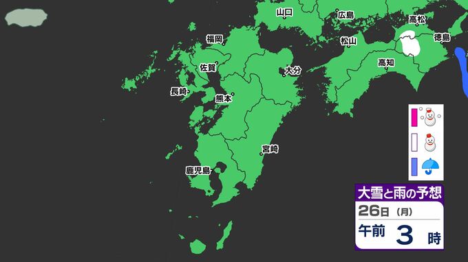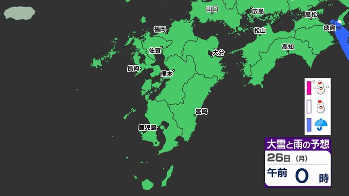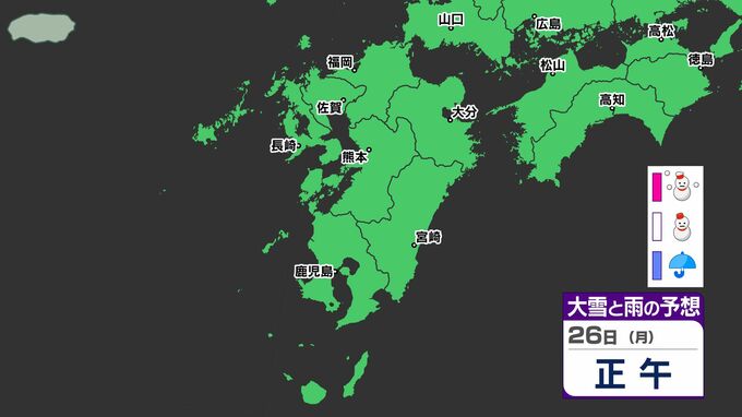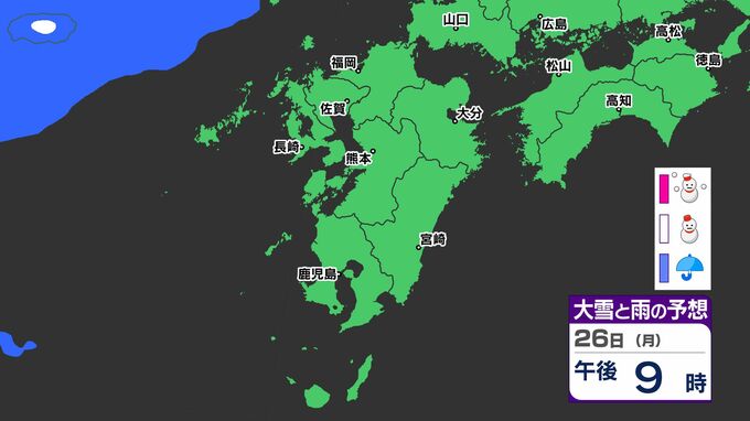 【九州 大雪情報】平地でも大雪のおそれ 福岡・熊本7cm 来週は南岸低気圧で再び「雪」【雪シミュレーション 23日(金)~27日(火)/ 九州各都市の週間予報】福岡・佐賀・長崎・大分・熊本・宮崎・鹿児島 南日本放送 2026年1月22日(木) 19:30 国内 天気 25日(日)晴れる所が多く、いったん小康状態になりますが、26日(月)~27日(火)は、九州の南の海上を進む「南岸低気圧」のため、福岡県・大分県・熊本県・宮崎県では「雨から雪」に変わるシミュレーションになっています。 26日(月)~27日(火)は「南岸低気圧」が通過し「雪」に変わる見込み この記事をはじめから → 九州 平地でも大雪のおそれ「雪シミュレーション」