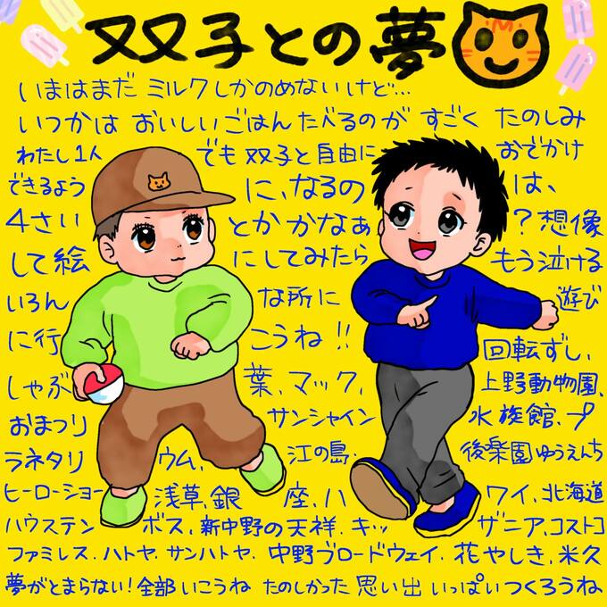 また、「双子との夢」と題した絵日記では「いまはまだミルクしかのめないけど…いつかはおいしいごはんたべるのがすごくたのしみ」と綴り、「わたし1人でも双子と自由におでかけできるように、なるのは、4さいとかかなぁ?」と想像した4歳になった双子の絵日記を公開しました。