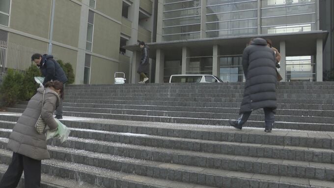 きのう21日の午後、名古屋市名東区の東邦高校では、きょうの入学試験を前に教職員らが校門前や屋外階段に融雪剤をまきました。