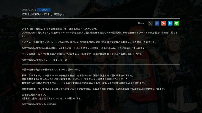 公式HPでは、「ROTTENGRAFFTYよりお知らせ」と題し、「Dr./HIROSHIに関しまして、以前からアルコール依存症および肘に慢性痛を抱えており今回長期にわたる治療およびリハビリが必要という判断に至りました」とHIROSHIさんの現状を報告。続けて、「治療に専念するべく、わびさびTOUR FINAL SERIES ONEMAN LIVE札幌公演以降の活動を休止する運びとなりました」と治療のため活動休止することを発表しました。