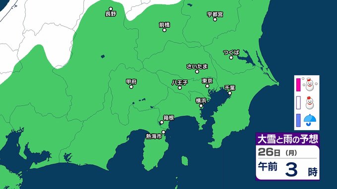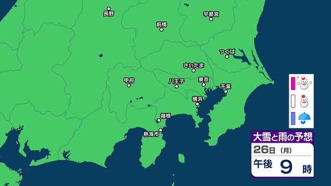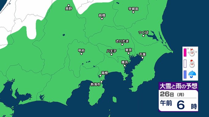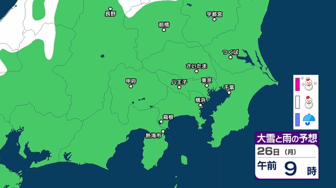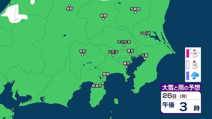 【東京の雪予想】24日(土)東京・埼玉で雪雲が…首都圏の今後の雪はどうなる? 23日(金)午前6時まで関東地方北部の多いところで30cmの降雪予想も 22日(木)~27日(火)東京、横浜、埼玉、千葉、茨城など首都圏の雪雨シミュレーション【気象庁/22日現在】 RSK山陽放送 2026年1月22日(木) 15:49 国内 天気 26日(月) シミュレーションでは、長野県と群馬県の一部に雪雲がかかる予想です。 【画像を見る】27日までの雪シミュレーション 29 30 31 32 33 34 35