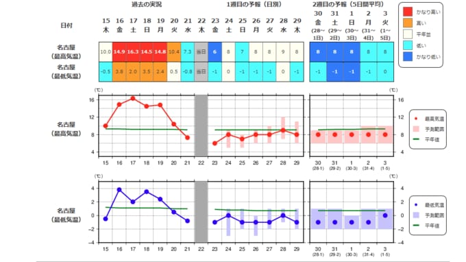 東海地方の向こう2週間の気温は、冬型の気圧配置が強まる時期があり、寒気の影響を受けやすいため低い日が多く、1月29日頃からはかなり低くなる可能性があります。