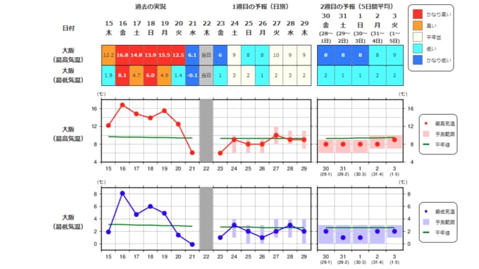 近畿地方の向こう2週間の気温は、冬型の気圧配置が強まる時期があり、寒気の影響を受けやすいため低い日が多く、1月29日頃からはかなり低くなる可能性があります。