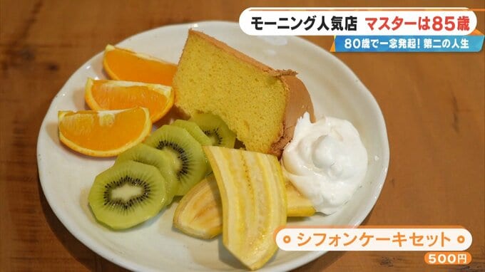 コーヒーにパン、卵、サラダ、自家製ゼリーなど盛りだくさんで、なんと450円!さらに、お持ち帰りに大人気!マスター手作りのシフォンケーキ。カフェタイムには、自家栽培のフルーツを添えて提供。新商品のフルーツがのったケーキに、ゼリーまでもが手作りです。