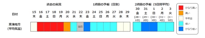 東海地方の向こう2週間の気温は、冬型の気圧配置が強まる時期があり、寒気の影響を受けやすいため低い日が多く、1月29日頃からはかなり低くなる可能性があります。