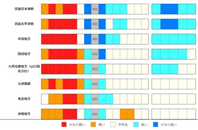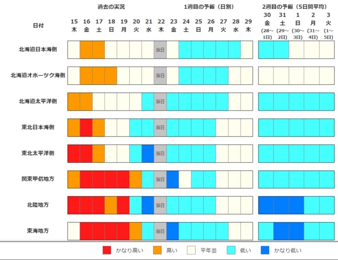 ・2週目の予報は中心の日に前後2日間を加えた5日間の平均(平均気温の5日間平均)です。平均期間は中心の日の下に表示しています。2週目のかなり高い(かなり低い)は、かなり高い(かなり低い)気温となる確率が30%以上のときに表示します。