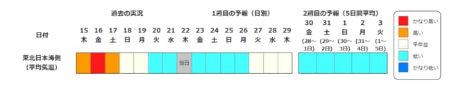 2週目の予報は中心の日に前後2日間を加えた5日間の平均(最高気温の5日間平均、最低気温の5日間平均、平均気温の5日間平均)です。平均期間を中心の日の下に表示しています。2週目のかなり高い(かなり低い)は、かなり高い(かなり低い)気温となる確率が30%以上のときに表示します。