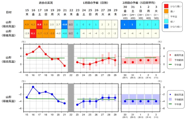・最近1週間の実況と今後2週間先までの気温の推移を表示しています。