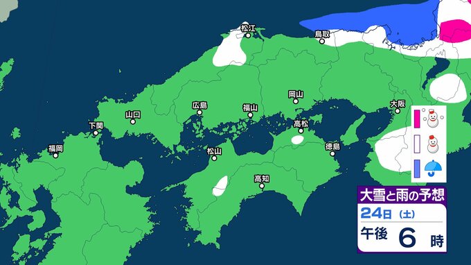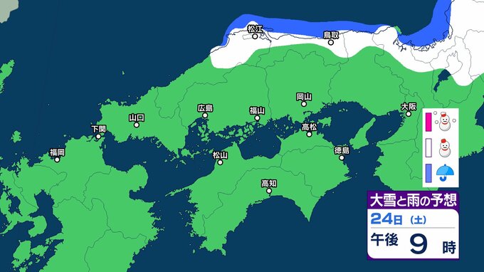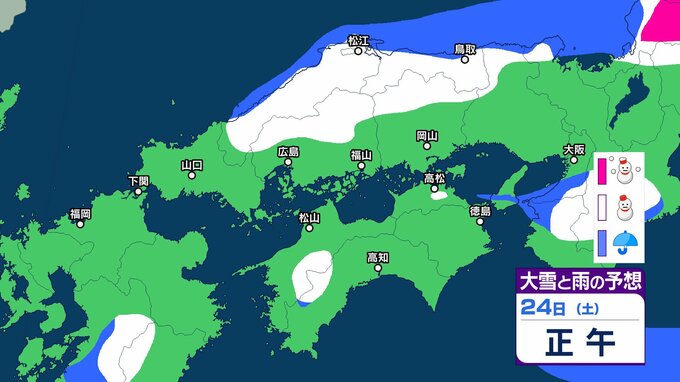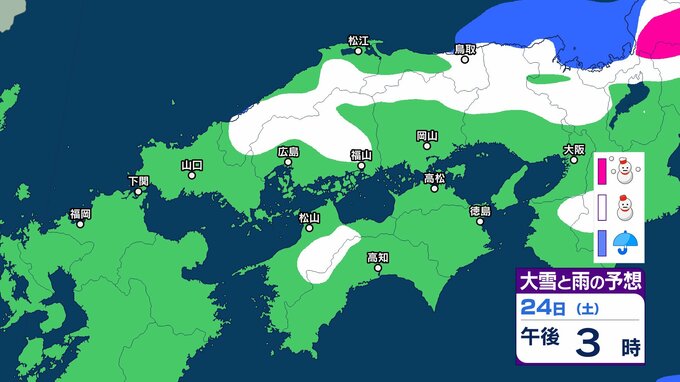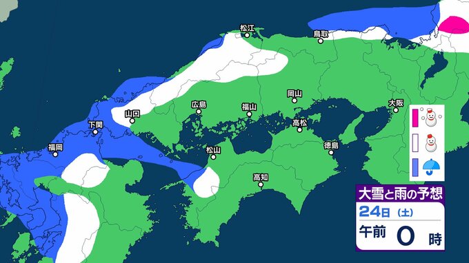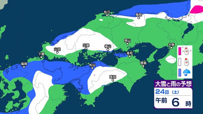 【中国・四国地方の雪 どうなる?】中国地方は降雪のピーク過ぎるも22日夜遅くにかけて寒気の影響が残る見込み 四国地方は23日夜遅くから24日午後にかけて山地を中心に大雪、平地でも積雪となるおそれ 22日(木)~27日(火)雪雨シミュレーション【気象庁 22日現在】 RSK山陽放送 2026年1月22日(木) 16:35 国内 天気 24日(土) 気象庁によりますと、四国地方では 24日18時から25日18時までに予想される24時間降雪量は多い所で、 平地 1センチ 山地 10センチ が予想されています。 【画像で見る】中国・四国の雪シミュレーション ▶中国・四国地方の雪雨シミュレーション