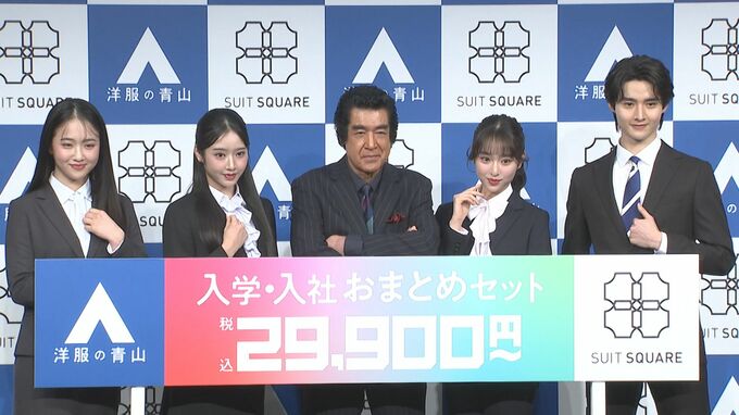 俳優・藤岡弘、さん、が、天翔愛さん、藤岡真威人さん、天翔天音さん、藤岡舞衣さんら藤岡ファミリーを引き連れ「洋服の青山フレッシャーズ新CM発表会」に登壇しました。