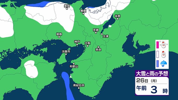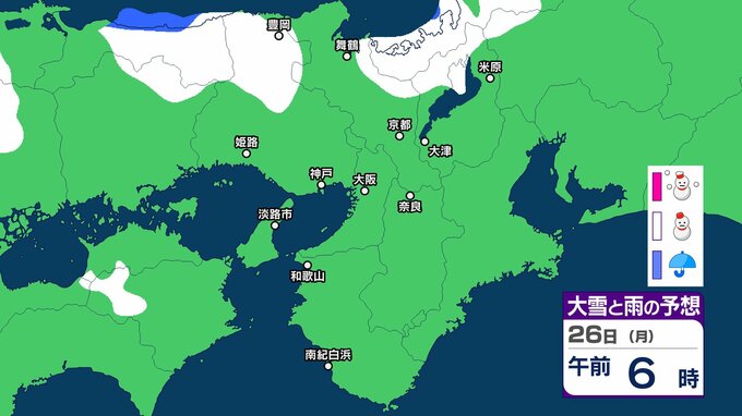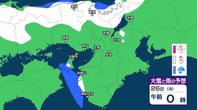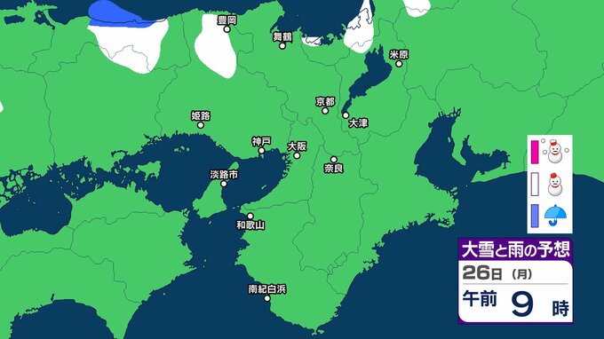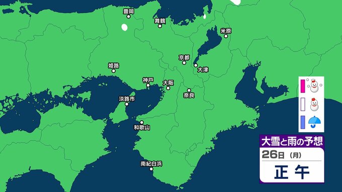 【関西の雪 どうなる?】近畿北部を中心にあす(23日)明け方にかけて大雪のおそれ 近畿北部平地 40センチ、中部平地10センチの降雪予想 路面の凍結など交通障害に注意・警戒を 22日(木)~27日(火)大阪、京都、神戸、奈良、滋賀、和歌山の雪雨シミュレーション【気象庁 21日現在】 RSK山陽放送 2026年1月22日(木) 17:02 国内 26日(月) ▶近畿地方の雪雨シミュレーション