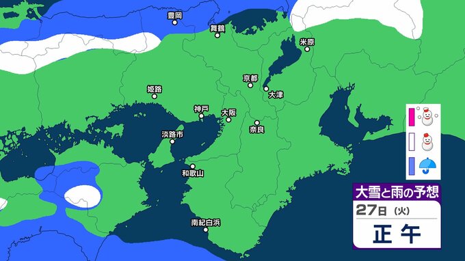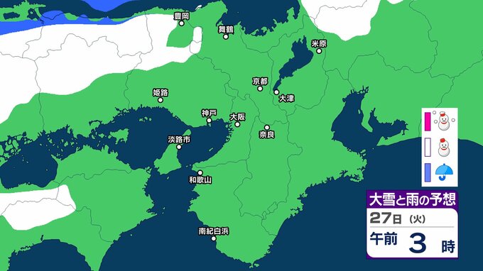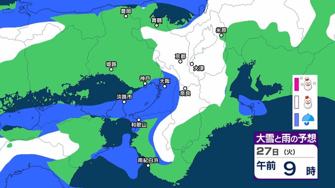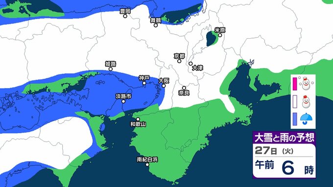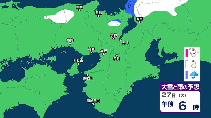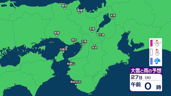 【関西の雪 どうなる?】近畿北部を中心にあす(23日)明け方にかけて大雪のおそれ 近畿北部平地 40センチ、中部平地10センチの降雪予想 路面の凍結など交通障害に注意・警戒を 22日(木)~27日(火)大阪、京都、神戸、奈良、滋賀、和歌山の雪雨シミュレーション【気象庁 21日現在】 RSK山陽放送 2026年1月22日(木) 17:02 国内 27日(火) 予想にはブレ幅があるため、今後の気象情報をこまめに確認してください。 ▶近畿地方の雪雨シミュレーション