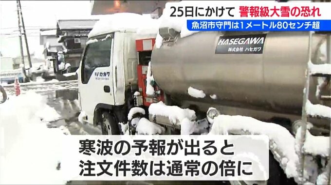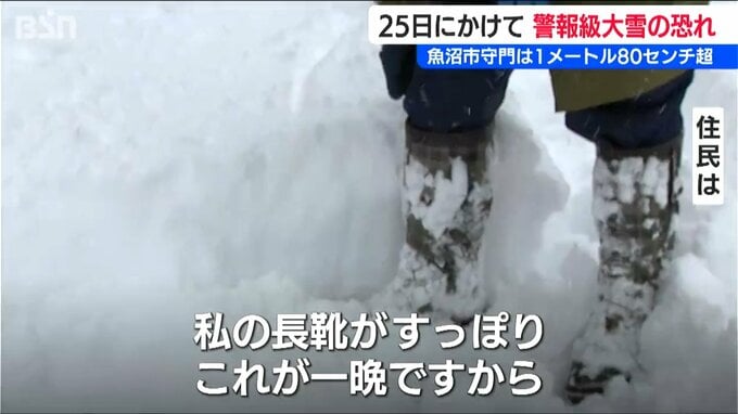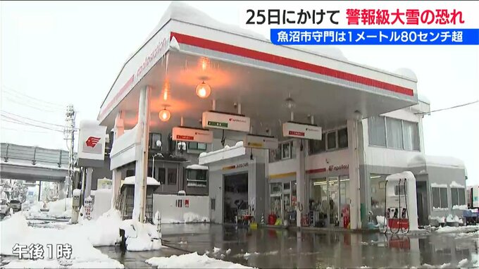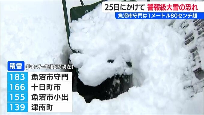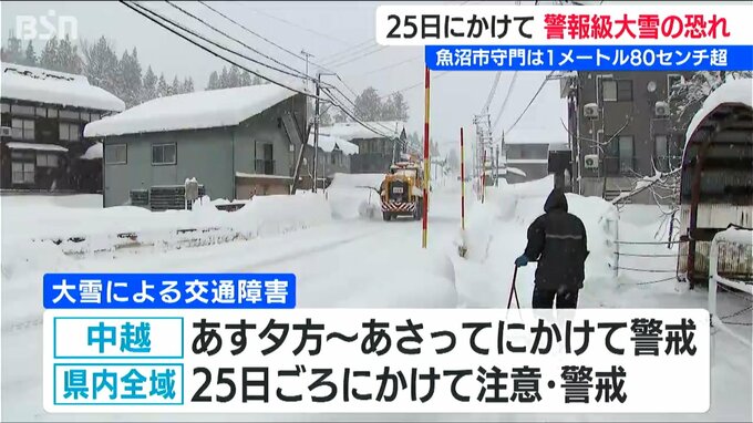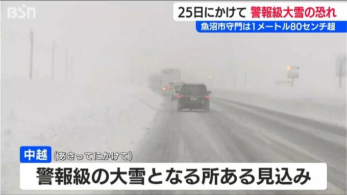 新潟地方気象台によりますと、中越では24日かけて警報級の大雪となる所がある見込みで、その後も、県内全域で25日ごろにかけて警報級の大雪となる恐れがあります。