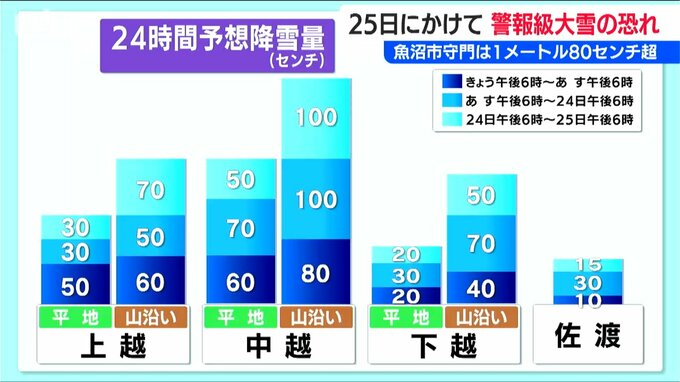 さらに24日の夕方までに中越の山沿いで100センチ、中越の平地で70センチなどとなり、25日の夕方までに中越の山沿いで100センチと予想されています。